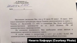 Сотрудник прокуратуры спрашивал о роли Кифорука в форуме "Свободные люди". Когда он отказался отвечать, сославшись на статью Конституции, тот стал хамить. Затем активисту вручили уведомление о том, что 18 марта в отношении него будет возбуждено административное дело за осуществление деятельности нежелательной организации".