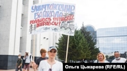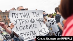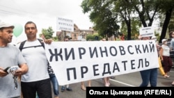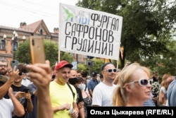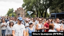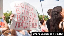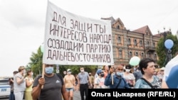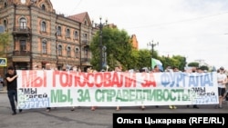В Хабаровске сегодня около 27 градусов – довольно жарко, но колонна уверенно возвращается на площадь перед зданием правительства региона – митинговать. В общей сложности митинг на сей раз продолжался около пяти часов. Помимо лозунгов "Свободу Фургалу", "Я/Мы – Сергей Фургал", "Хабаровск своих не бросает" все чаще звучали "Путин – вор", "Чемодан – вокзал – Самара", "Дегтярев – иди в баню".