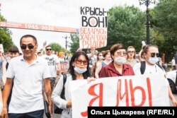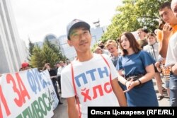 – Не снимайте нас, мы с сигаретами! – просит один из участников акции, который еще до начала сбора митингующих организовал раздачу воды. – Мы ж видим, жарко, вот и приехали. Сами по себе. А сигареты не надо в кадр, а то какой-нибудь Соловьев опять скажет: только гопники в Хабаровске митингуют.