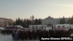 В Комсомольске-на-Амуре акция прошла относительно мирно. На площади Юности собрались несколько разрозненных групп людей, всех вместе примерно 50-60. Лишь один человек отважился развернуть плакат – с надписью "Свободу Навальному!".