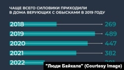 За пять лет после запрета организаций Свидетелей Иеговы российские силовики провели в домах верующих около 1,8 тысячи обысков в 71 регионе страны. Рекордным по количеству обысков и задержаний был 2019 год. В дома Свидетелей Иеговы врывались почти вдвое чаще, чем в 2018-м: число обысков увеличилось с 269 до 489. Резкое увеличение количества обысков и задержаний произошло сразу после того, как в декабре 2018 года президент Путин пообещал разобраться с тем, что верующих массово записывают в экстремисты и преследуют.