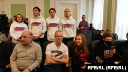 На приговор Треповой пришли потерпевшие по делу в белых худи с российским триколором.