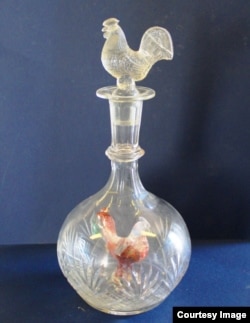 "На заводе делали цветные графины. Крынки, сначала надувают, туда садят цветного стеклянного петуха. Потом горлышко нагревают и сужают, получается графин с петухом".